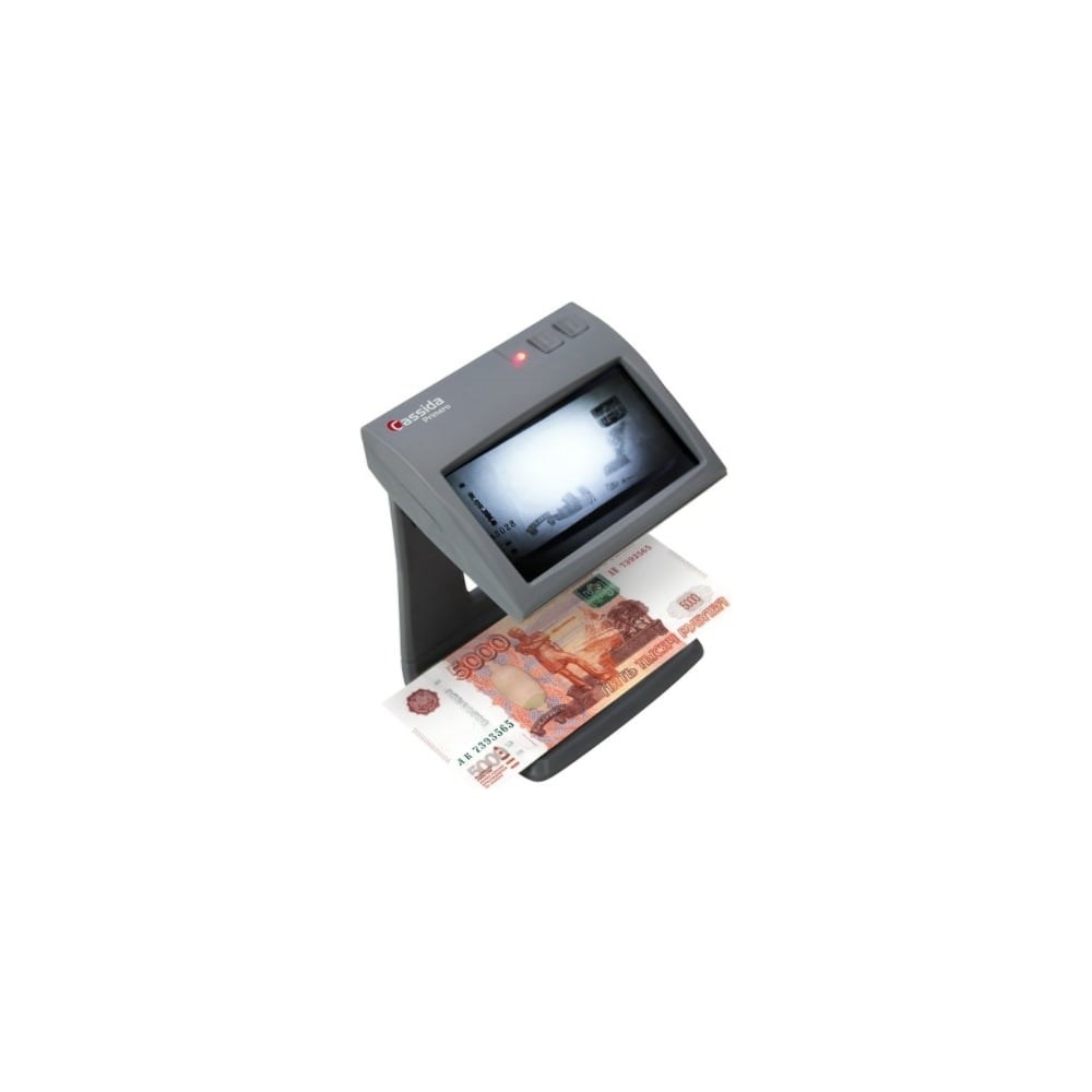 Cassida Primero Laser— модель компактного просмотрового детектора с проверкой защитного признака Антистокс. Экономичный детектор позволяет осуществлять экспресс-проверку защитных признаков ’Спецэлемент И’ (Антистокс) и ’Спецэлемент М’, а также ИК-меток. Антистокс-эффект присутствует на всех банкнотах российских рублей. Встроенный монитор и камера с высоким разрешением позволяют легко и быстро проверить банкноты на подлинность. Камера с оптическим инфракрасным фильтром передает изображение банкноты на большой встроенный монитор, позволяя быстро и качественно проверить подлинность купюр. На мониторе защитные признаки отображаются в виде фрагментов изображений, нанесенных ИК-метамерными красками. Несмотря на небольшую высоту детектора Cassida Primero Laser, камера с большим углом обзора обеспечивает широкий обзор банкноты на дисплее. Возможность подачи банкнот веером обеспечивает ускоренную проверку подлинности.