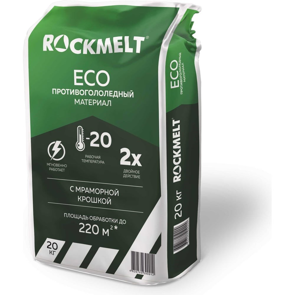 Противогололедный реагент 20кг Rockmelt ECO 63418 - реагент двойного действия, служит для покрытия дорог и тропинок при наледи или снежном накате. Его можно использовать для профилактики образования гололеда. В состав материала входят хлорид кальция, минеральная соль и мраморная крошка. Эффективность реагента проявляется при температуре до 20 градусов ниже нуля.