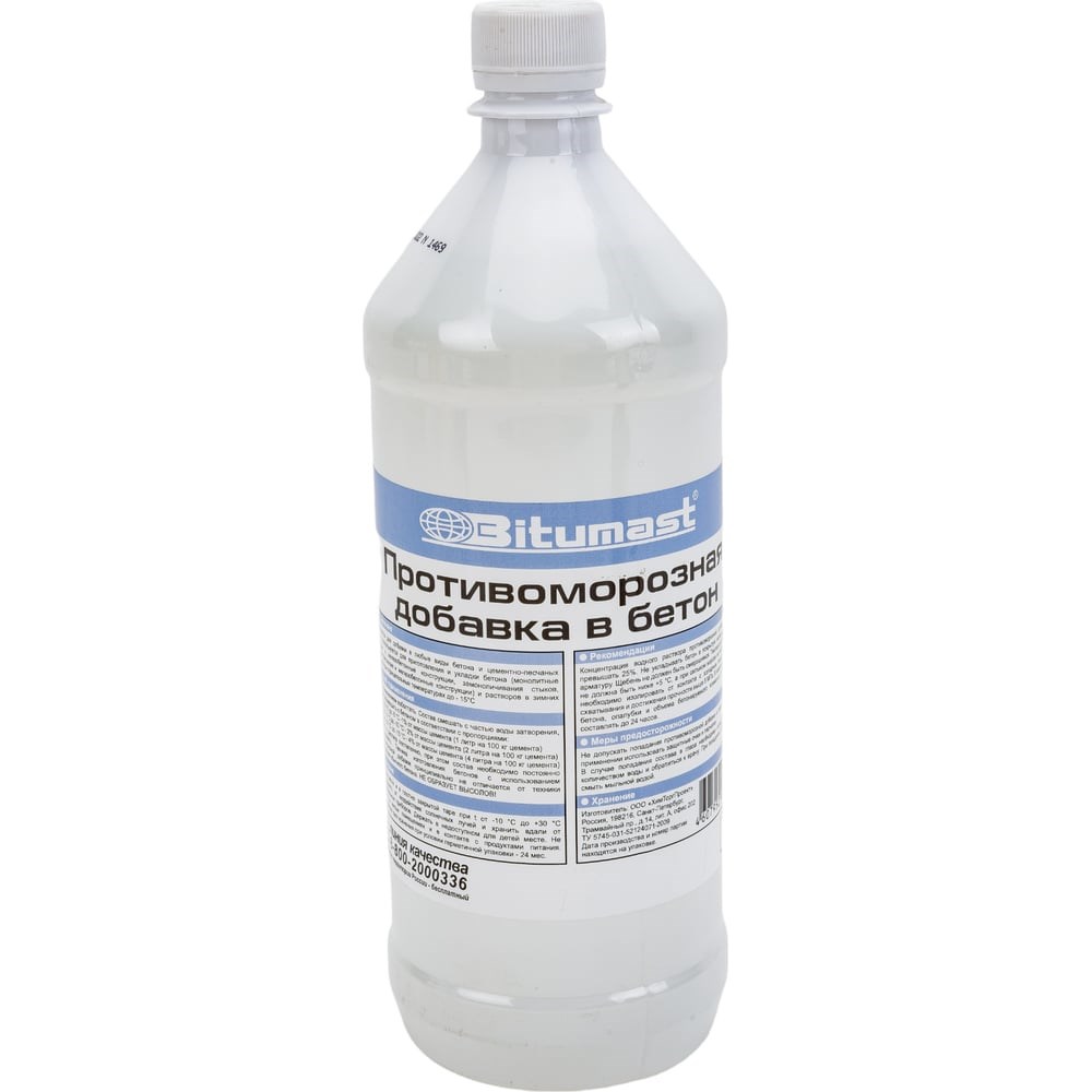 Противоморозная добавка в бетон Bitumast 1 л 4607952900981 обеспечивает отверждение бетона в зимних условиях при отрицательных температурах до -15°С. Применяется для любых видов бетона, обеспечивает быстрый набор прочности, уменьшает количество затворной воды на 10-15% и не образует высолов. Добавляется в бетон при отрицательных температурах: От 0°С до - 5°С – 1% от массы цемента (1 литр на 100 кг цемента) От 0°С до -10°С – 2% от массы цемента (2 литра на 100 кг цемента) От 0°С до -15°С – 4% от массы цемента (4 литра на 100 кг цемента)