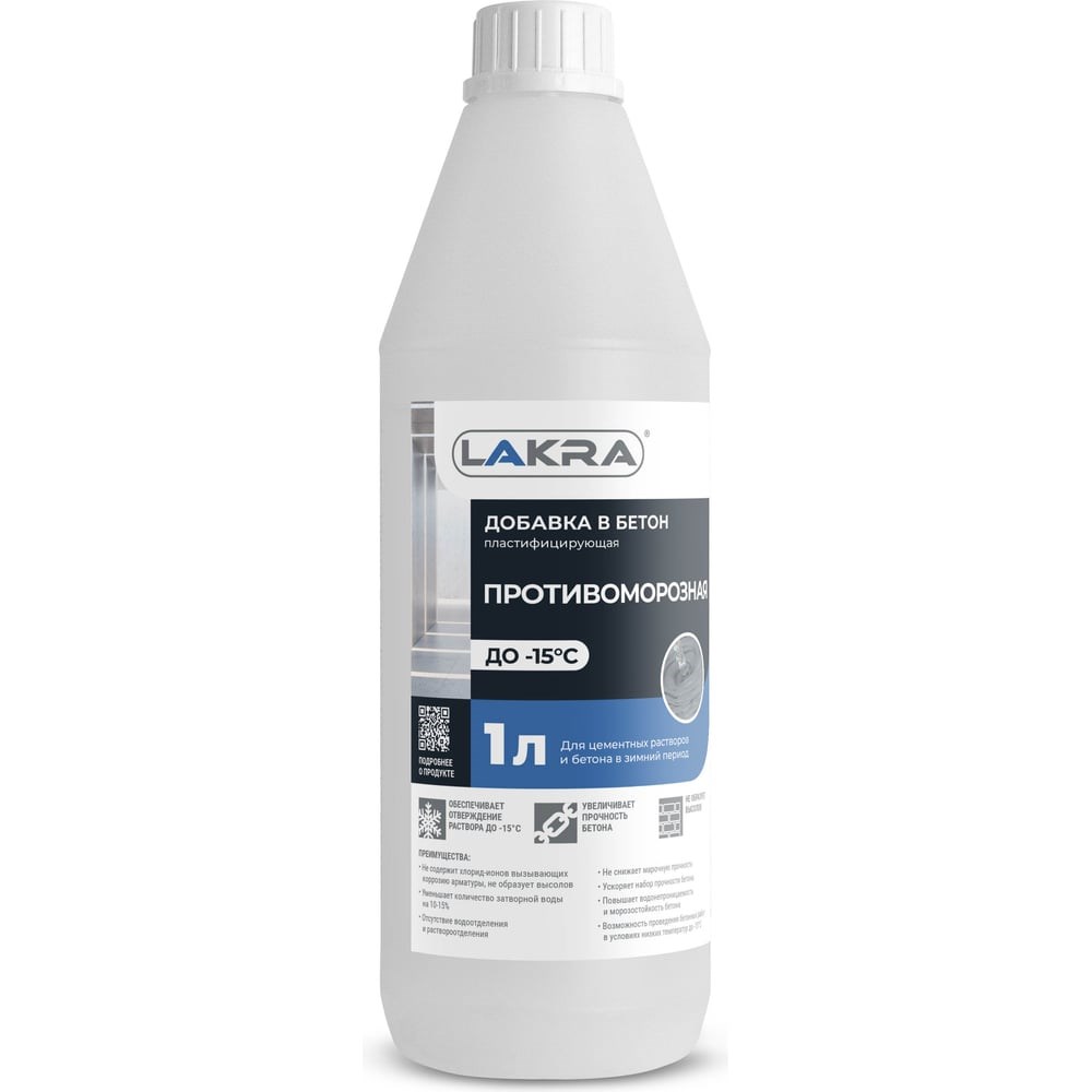 Противоморозная добавка в бетон Лакра 1 л 90005265627 значительно ускоряет время застывания бетонного раствора и цементной смеси при температуре до -15ºС. Продукт позволяет поводить строительные работы (кладка кирпича, нанесение штукатурки, возведение фундамента) в зимнее время года. Состав предотвращает образование ржавчины и высолов, повышает водонепроницаемость и морозостойкость бетона.