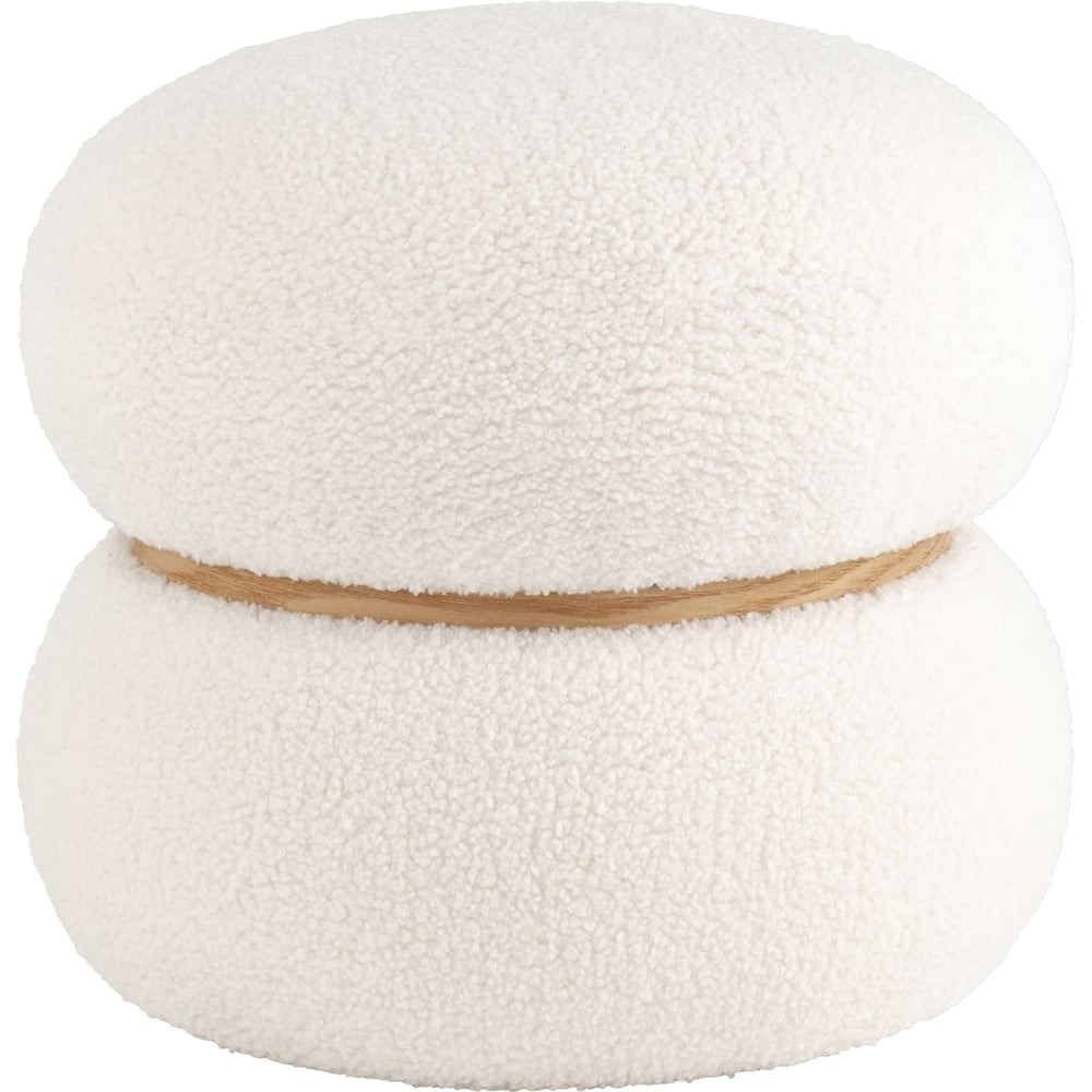 Лаконичный круглый пуф в скандинавском стиле. Мягкая обивка выполнена из искусственного меха тедди - очень мягкий и приятный на ощупь материал. Прочный каркас из фанеры выдерживает на грузку до 150 кг. Вставка посередине из светлого массива дерева гармонично сочетается с белой обивкой. Высота пуфа: 36 см. Диаметр: 38 см.