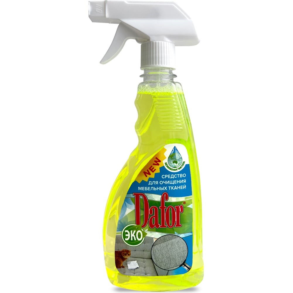 Экологически безопасное чистящее средство Дафор (Dafor) предназначено для очистки мебели (мебельных тканей), салона автомобиля, ковров от грязи, масляных и жировых пятен, следов жевательной резинки, мела, маркера, фломастера, ручки и т.п.Применяется для удаления пятен с одежды, в том числе детской.Не нарушает структуру и цвет ткани. Снимает статическое электричество. Обновляет внешний вид. Устраняет неприятные запахи.Средство нейтрально ко всем видам поверхностей. Безопасно для людей и животных, полностью биоразлагаемо.Способ примененияПеред применением взболтать! Открыть клапан распылителя. С расстояния 10-15 см равномерно нанести средство на очищаемую поверхность (снизу вверх на вертикальной поверхности) и, не дав высохнуть, протереть поверхность влажной салфеткой или тряпочкой. После окончания работы привести клапан в исходное положение.