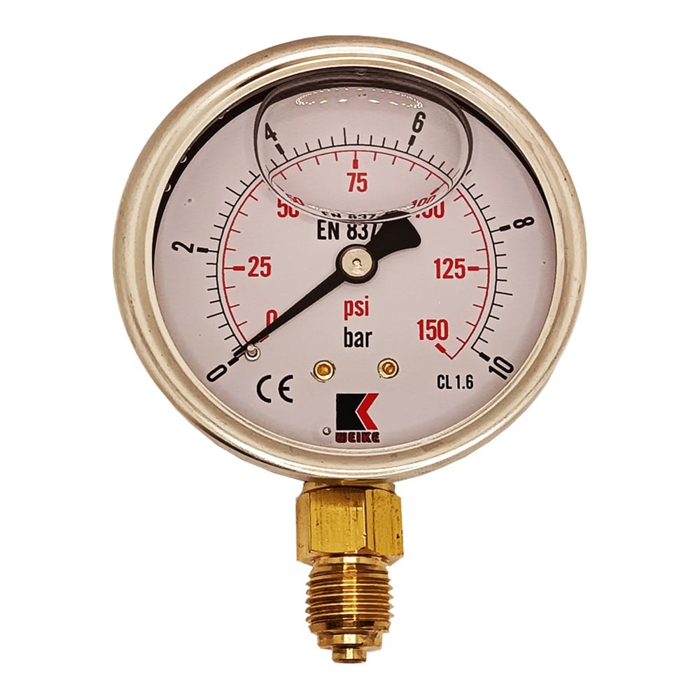 Манометр гидравлический деформационный с трубчатой пружиной, заполненный глицерином. Его тип радиальный – выход штуцера расположен перпендикулярно центральной оси манометра. У представленного манометра 2 шкалы измерения в Бар (bar / черная шкала) и Пси (psi / красная шкала). Класс точности: 1,6 Ключ штуцера: 14 х 14 мм Заполнение корпуса: глицерин 99,7% Степень защиты: IP65 Манометр является виброустойчивым и применяется при соответствующих внешних факторах, для измерения давления газообразных и жидких, несильно вязких и не кристаллизирующихся сред, не агрессивных к деталям из медных сплавов. Эти виброустойчивые глицеринозаполненные манометры широко используются в насосном и компрессорном оборудовании, применяются в машиностроении, нефтехимической, пищевой, фармацевтической промышленности.