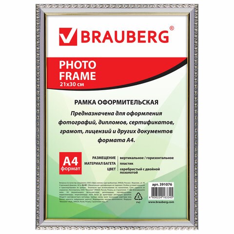 Выполнена из пластика серебристого цвета с двойной позолотой, за счет чего отлично впишется в домашний и деловой интерьер. Имеется возможность вертикального и горизонтального подвеса. Ширина багета - 16 мм. Аккуратный вид достигается благодаря стеклянной вставке. Микрогофрокартон обеспечивает плотное прилегание и отсутствие в будущем деформации содержимого в рамке. Термоусадочная пленка гарантирует сохранность рамки при транспортировке, отсутствие сколов и потертостей.