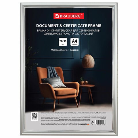 Рамка 21х30 см со стеклом, багет 14 мм пластик, BRAUBERG "HIT2", матовое серебро, 391318