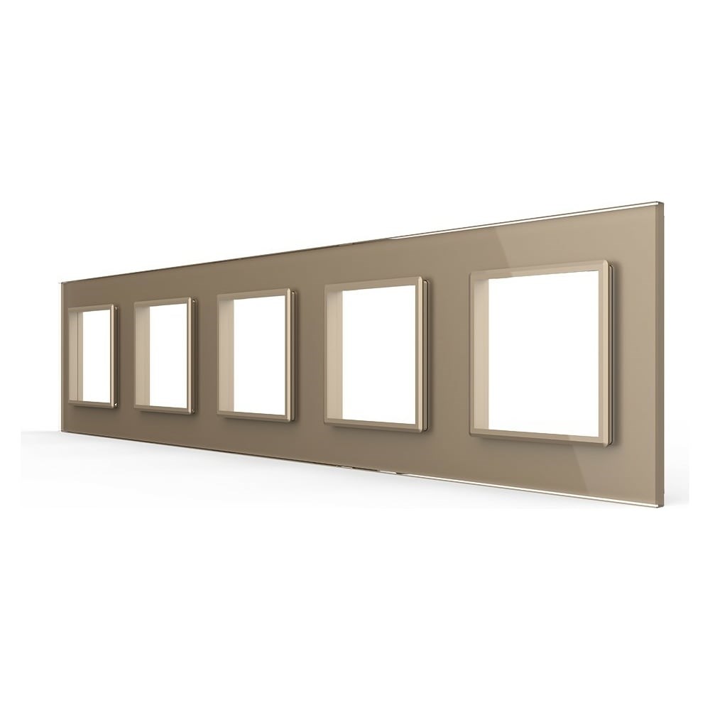 Рамка на пять постов LIVOLO для пяти розеток золотого цвета используется для установки на механизмы силовых розеток, клавишных выключателей, слаботочных и мультимедийных розеток, датчиков, подсветок, терморегуляторов, сенсорных выключателей серииQuadro иModule.Изготовлена из закаленного стекла OptiWhite, не имеющего никаких оттенков, присущих стандартным «бесцветным» стеклам. Устойчива к механическим воздействиям, появлению царапин и прочих мелких дефектов.Не нуждается в особом уходе. Необходимо лишь периодически протирать панель влажной салфеткой.МонтажДостаньте комплектующие из упаковки.Перед установкой обязательно обесточьте механизм.Зафиксируйте механизм в металлическом суппорте для дальнейшей установки к монтажной коробке (подрозетнику).Подсоедините провода и затяните клеммы строго в соответствии со схемой подключения.Зафиксируйте механизм в монтажной коробке (подрозетнике) с помощью винтов.Установите стеклянную лицевую рамку.Подайте питание на механизм.Примечание: установка осуществляется в монтажную коробку (подрозетник) с минимальной глубиной 40 мм и диаметром 62-70 мм. Межцентровое расстояние для крепёжных винтов должно составлять не менее 60 мм.Меры предосторожностиЧтобы не получить травму и не повредить рамку, внимательно прочтите все инструкции.Потребитель несет ответственность за любой личный и имущественный ущерб, возникший в результате неправильного использования продукта в соответствии с руководством пользователя.