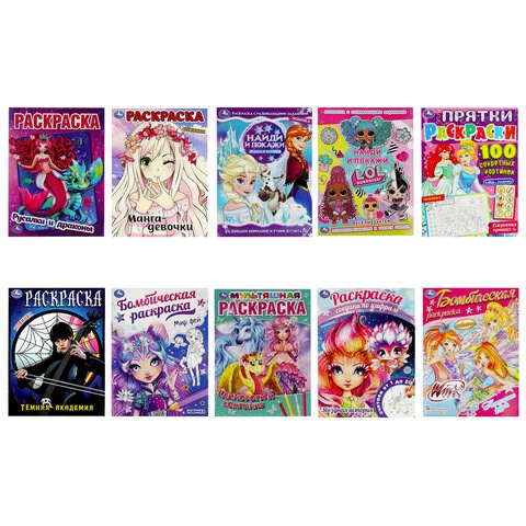 Раскраски "Для девочек", КОМПЛЕКТ 10 шт., А4, 214х290 мм, 16 стр., лицензия, УМКА