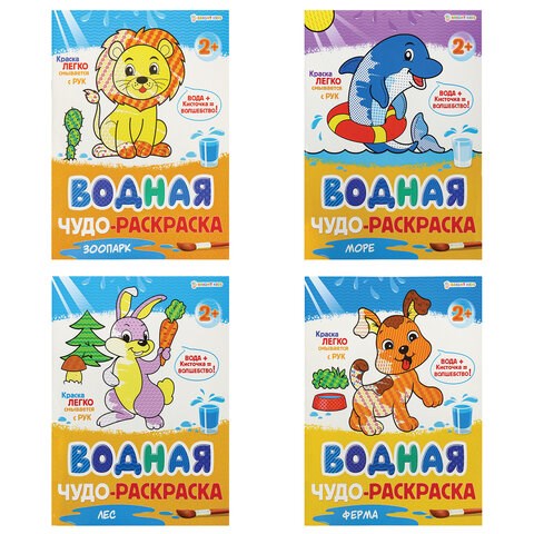 Раскраски водные "ПЕРВАЯ ВОДНАЯ РАСКРАСКА", КОМПЛЕКТ 4 шт., 198х260 мм, 16 стр., ПП, 33684