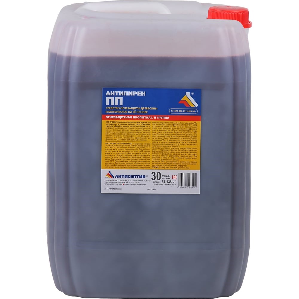 Раствор антипирена ЗАО "Антисептик" ПП в канистре 30 литров 00-00003663 обеспечивает защиту деревянных конструкций, эксплуатируемых в условиях закрытых сухих помещений с относительной влажностью воздуха не более 80% (стропила, обрешетка кровли и т.п.). Поверхностная огнезащитная пропитка затрудняет распространение пламени по поверхности древесины и тем самым облегчает пожаротушение. В ряде случаев она исключает возможность возникновения пожара от действия малокалорийных источников зажигания (пламени спички, окурка, искр короткого замыкания и электросварки и др.). Антипирен «ПП» относится к средствам I, II группы огнезащитной эффективности для древесины по ГОСТ Р 53292-2009. Устойчив к старению. Гарантийный срок службы огнезащитной обработки антипиреном «ПП» - от одного года и более в зависимости от поглощения (удержания) препарата древесиной и условий ее эксплуатации.