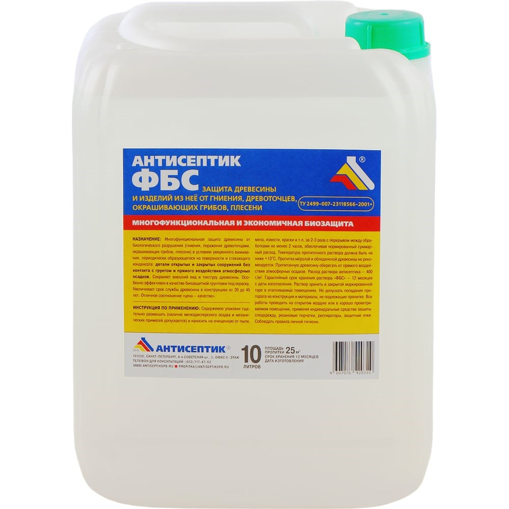Раствор антисептика ЗАО "Антисептик" ФБС 10 л 00-00003689 предназначен для защиты древесины от гниения, плесени, окрашивающих грибов, поражения древоточцами. Продукт наносится на деревянные конструкции открытых и закрытых сооружений, которые служат в условиях без контакта с грунтом и влагой (каркасы, навесы, эстакады, внутренняя отделка помещений). Возможно использование в качестве биозащитной грунтовки под окраску для наружных работ.