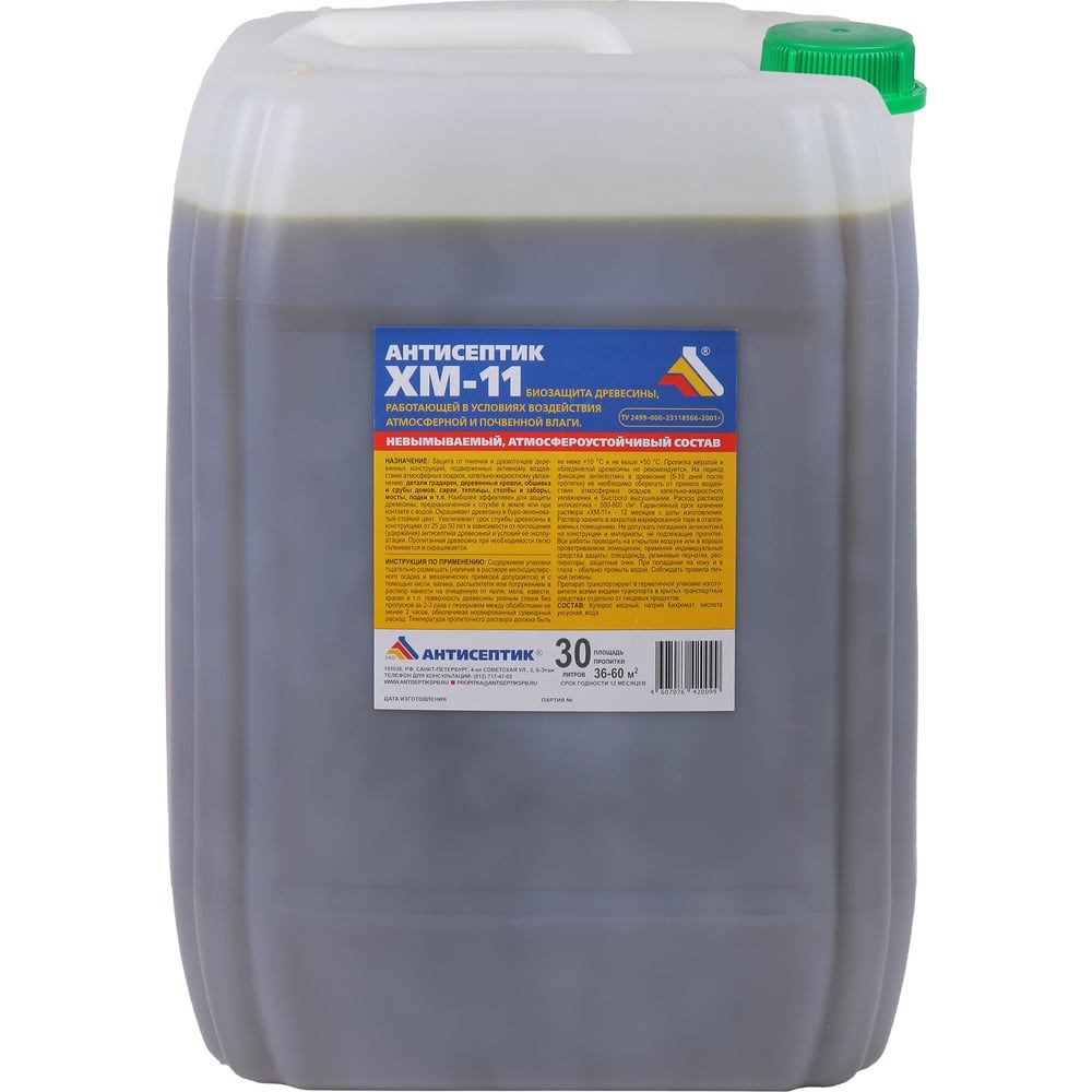 Раствор антисептика ЗАО "Антисептик" ХМ-11 в канистре 30 литров 00-00003716 предназначен для эффективной защиты деревянных строительных конструкций от биологического разрушения (гниения, поражения древоточцами). Состав применяется для древесины в условиях ее непосредственного контакта с грунтом и водой (сваи, деревянные детали опор линий связи и электропередач, заборные и дорожные столбы, шпалы, лаги утопленные в грунт, настилы мостов, рудничные стойки, деревянные кровли, деревянные контейнеры, обшивка срубов, фронтонов, деревянные элементы теплиц).
