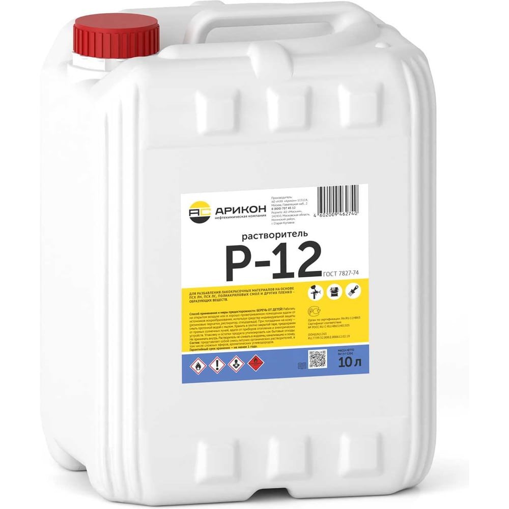 Растворитель Арикон Р-12 канистра 10л RAS1210 всегда есть в арсенале мастеров, работающих над покраской автомобилей, предназначен для нескольких видов эмалей, включая эмали базового типа, акриловые и нитроэмали. Также его используют для разбавления или растворения грунтов, нитролаков, акриловых лаков и прочих красок, предназначенных для окрашивания машин и содержащих акриловые смолы.При его использовании вещества, образующие плёнку, приобретают устойчивость к ультрафиолетовому излучению. Они не выгорают на солнце, не зависят от атмосферных воздействий и красиво выглядят благодаря появляющемуся блеску.Р-12 также можно использовать для удаления следов клея от скотча, этикеток, промывки лакокрасочного оборудования.разбавления лакокрасочных материалов на основе ПСХ ЛН и ПСХ ЛС (эмали: ХВ-533, ХВ-785, ХВ-1120, АК-194), полиакриловых смол и других пленкообразующих веществ.промывания и очистки лакокрасочных инструментов: кистей, валиков, емкостей.промывания лакокрасочного технического оборудования: краскопульта, сопла, емкости для краски и пр.Применяется в автомобильной промышленности и быту.