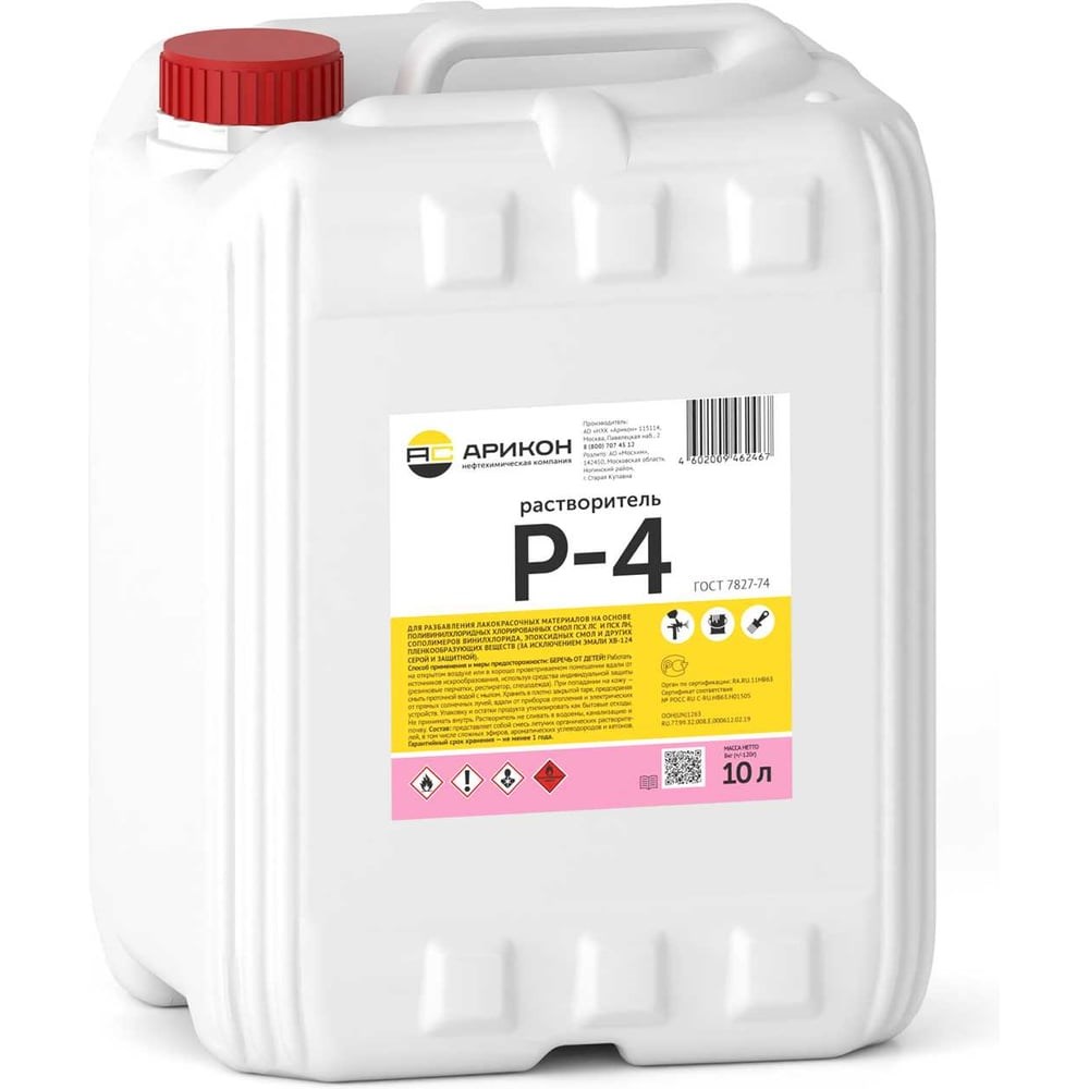 Растворитель Арикон Р-4 ГОСТ канистра 10л предназначен для разбавления лакокрасочных материалов на основе поливинилхлоридных и хлорированных смол ПСХ ЛС и ПСХ ЛН, сополимеров винилхлорида, эпоксидных смол и других пленкообразующих веществ (за исключением эмали ХВ 124 – серой и защитной).Разбавляет:краски и эмали ХВ-16, ХВ-112, ХВ-124, ХВ-125, ХВ-142, ХВ-179, ХВ-518, ХВ-519, ХВ-553, ХВ-714, ХВ-750, ХВ-782, ХВ-1100, ХВ-785, ХВ-1120, ПХВ-29, ПХВ-101, ХВ-1149, ХВ-5169, ХС-119, ХС-527, ХС-710, ХС-717,ХС-720, ХС-724, ХС-747,ХС-748, ХС-759, ХС-781, ХС-5163лаки: ХС-76, ХС-724;грунтовки: ХВ-062, ХВ-079, ХС-010, ХС-059, ХС-068, ХС-077, МС-067;шпатлевки: ХВ-004, ХВ-005, ЭП-0020.