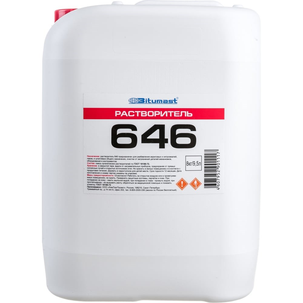 Растворитель Bitumast 646 9,5 л /8 кг 4607952901117 поставляется в канистре. Средство служит для разбавления акриловых и нитроэмалей, а также шпатлевок и лаков. Растворитель очищает от загрязнения инструменты, детали и оборудование.