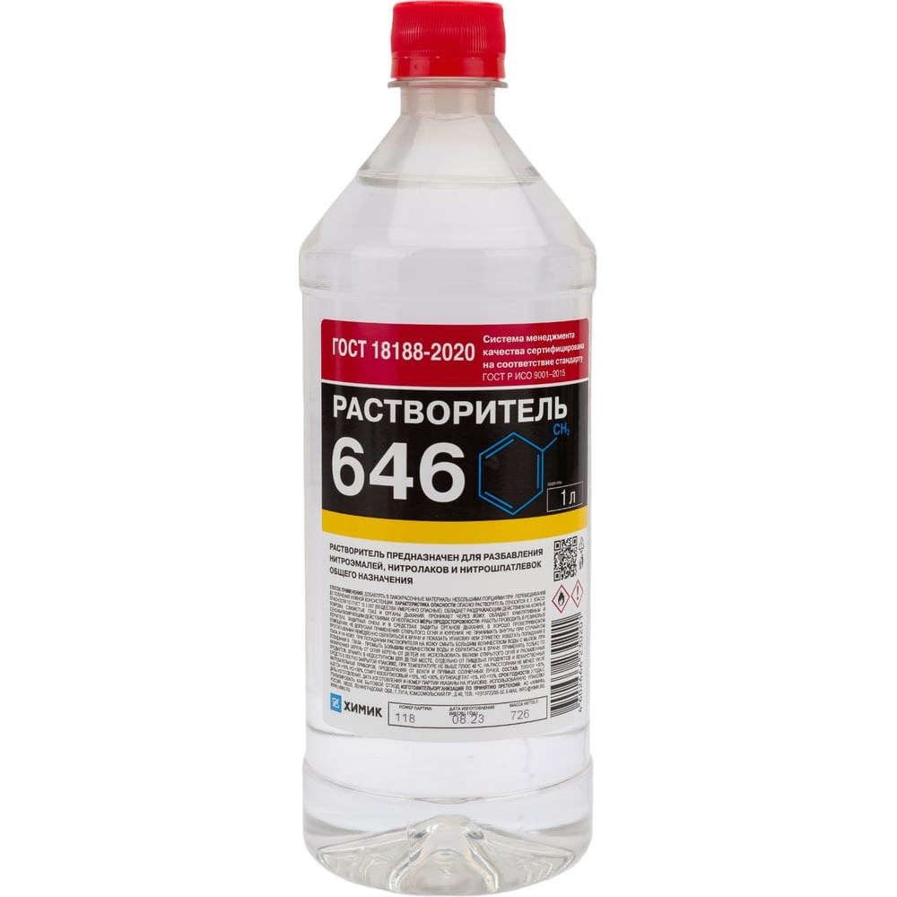 Растворитель ХИМИК 646 1 л 66230201 предназначен для применения в быту, разбавления ЛКМ, в том числе нитроэмалей, нитролаков и нитрошпатлевок общего назначения. Производится по ГОСТ 18188-72. Дополнительные технические характеристики: Плотность: 0,803 г/куб. м. Состав: толуол >30%, ацетон >15%, но <30%, спирт изобутиловый >15%, но <30%, бутилацетат >5%, но <15% Температура хранения: не выше 40 градусов. Класс опасности: 3 класс. Срок годности: 24 месяца со дня изготовления.