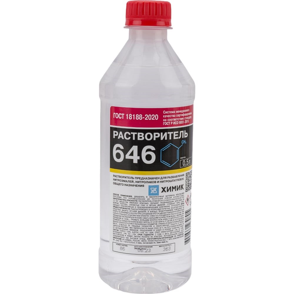 Растворитель ХИМИК 646 0,5 л 66230805 предназначен для применения в быту, разбавления ЛКМ, в том числе нитроэмалей, нитролаков и нитрошпатлевок общего назначения. Производится по ГОСТ 18188-72. Дополнительные технические характеристики: Плотность: 0,803 г/куб. м. Состав: толуол >30%, ацетон >15%, но <30%, спирт изобутиловый >15%, но <30%, бутилацетат >5%, но <15% Температура хранения: не выше 40 градусов. Класс опасности: 3 класс. Срок годности: 24 месяца со дня изготовления.