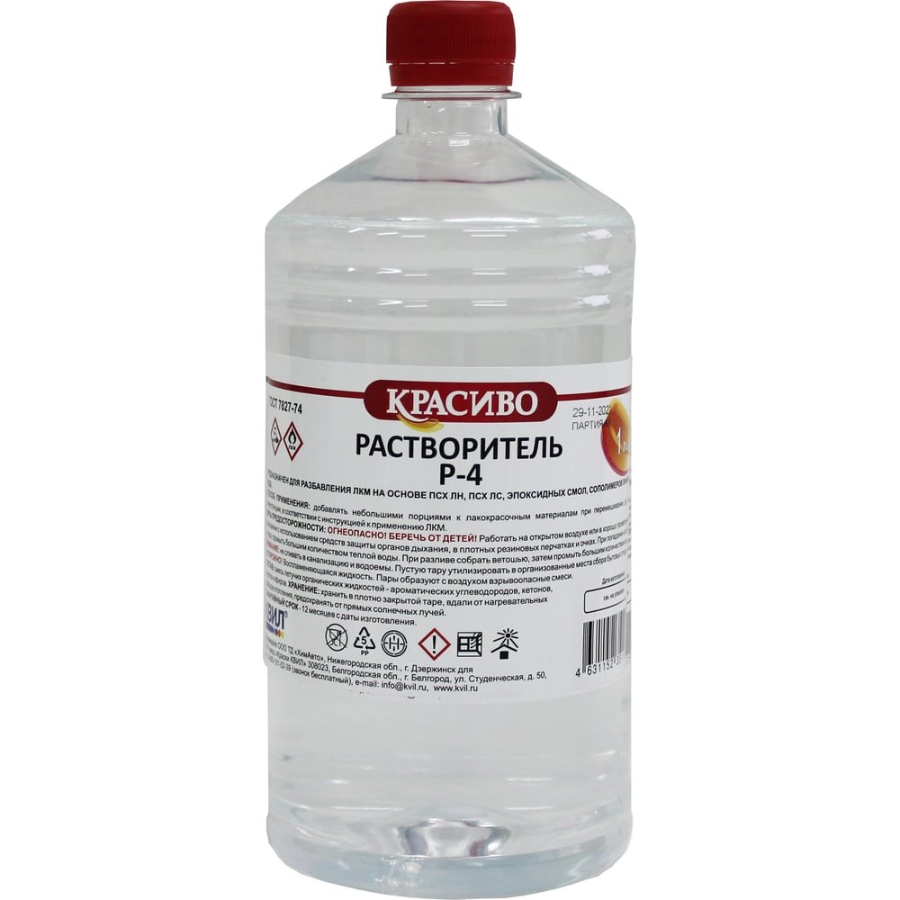 Растворитель Красиво Р-4 (1 л/0,68 кг) 4631152351182 предназначен для разбавления ЛКМ на основе ПСХ ЛН, ПСХ ЛЕ, эпоксидных смол, сополимеров винилхлорида. СОСТАВ: смесь летучих органических жидкостей - ароматических углеводородов, кетонов, спиртов и эфиров. СПОСОБ ПРИМЕНЕНИЯ: добавлять небольшими порциями к лакокрасочным материалам при перемешивании до нужной консистенции, в соответствии с инструкцией к применению ЛКМ. Огнеопасно! Токсично! Вредно при контакте с кожей! МЕРЫ ПРЕДОСТОРОЖНОСТИ: работать на открытом воздухе или в хорошо проветриваемом помещении с использованием средств защиты органов дыхания, в плотных резиновых перчатках и очках. При попадании на кожу или в глаза, промыть большим количеством теплой воды. При разливе собрать ветошью, затем промыть большим количеством воды. ВНИМАНИЕ: не сливать в канализацию и водоемы. Тару с остатками продукта плотно закрыть и утилизировать в организованные места сбора бытовых отходов. ХРАНЕНИЕ: хранить в плотно закрытой таре, вдали От нагревательных приборов отопления, предохранять от прямых солнечных лучей.