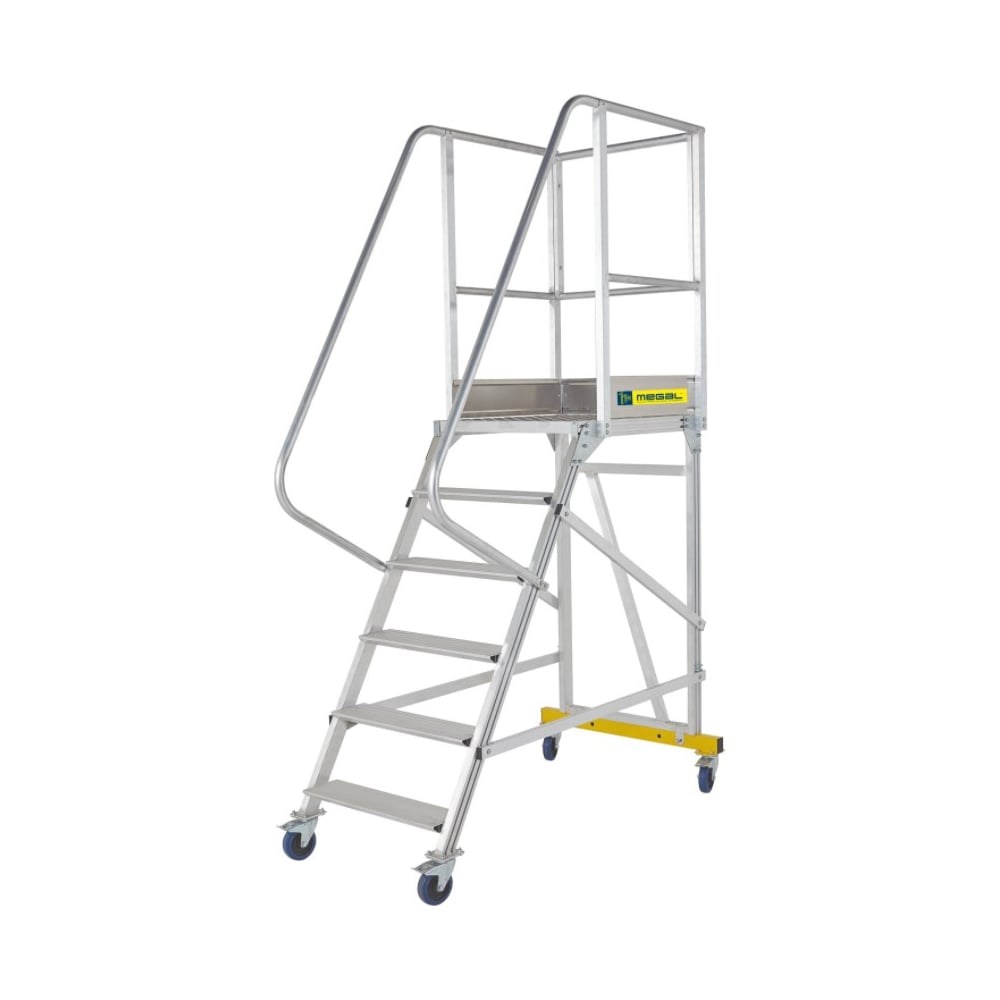 Разборная вышка-стремянка на колесах MEGAL ВС2-3.5 150 кг+150 кг 221535 предназначена для работ в торговых залах, на складах, вдоль стеллажей и других объектов, при проведении ремонтных, монтажных и иных работ. Конструкция выполнена из алюминиевых профилей высокой прочности и имеет усиленную траверсу. Противоскользящие ступени из специального эксклюзивного рифленого профиля обеспечивают безопасный подъем/спуск. Мягкие колеса (диам. 125 мм) с фиксатором позволяют без усилий перемещать вышку-стремянку в пределах рабочей зоны. Все соединительные узлы и элементы полностью безопасны, обработаны и одобрены службой контроля качества. Обратите внимание! Количество ступеней не соответствует представленному на фото.