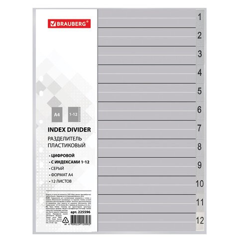Разделитель пластиковый BRAUBERG, А4, 12 листов, цифровой 1-12, оглавление, серый, РОССИЯ, 225596