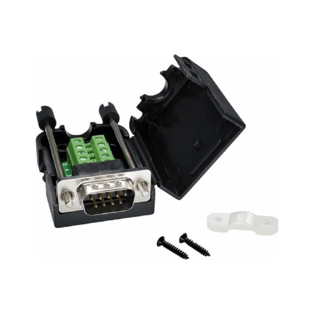 Разъём DB9 RS232 имеет клеммную колодку для подключения кабеля и пластиковый кожух для удобного монтажа и подключения. Данный тип разъёма имеет вход "папа" с штырями. Разъём DB9 RS232 применяется с различными промышленным и бытовым оборудованием. Данный разъём часто используется с промышленными контроллерами и панелями оператора HMI для подключения к коммуникационнымпортам RS232/RS485 в зависимости от распиновки. Разъём DB9_M имеет клеммную колодку для простого и быстрого подключения с 9 пинами.