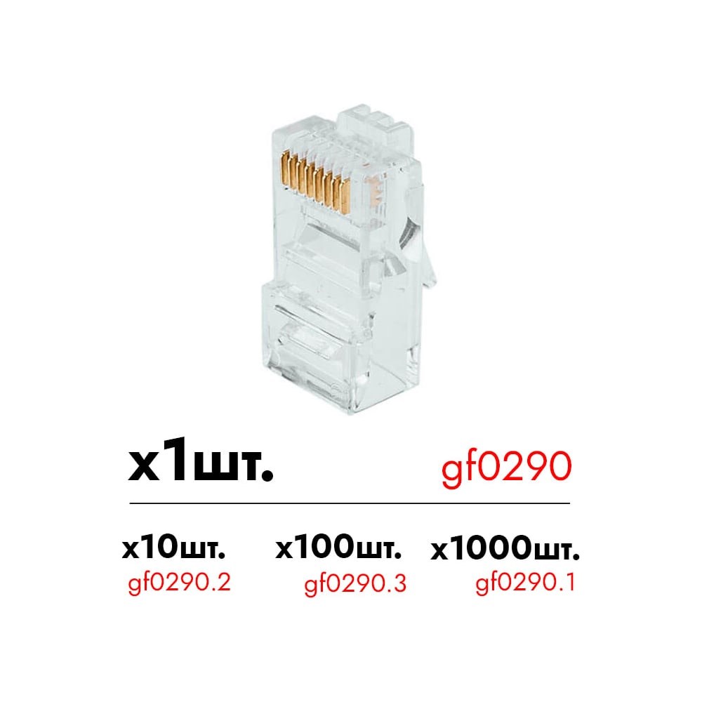 Разъем для подключения кабеля типа витая пара UTP CAT5e к коммутационному оборудованию. Дополнительные характеристики: Тип разъема: штекер RJ-45 8p-8c. Тип монтажа: под обжим. Категория кабеля: UTP CAT5e. Материал корпуса: Поликарбонат. Материал контактов: Медь. Максимальное напряжение: до 60В DC. Максимальный ток: до 40мА. Сечение жилы: 0.2 мм2. Усилие разрыва: ≥89 N. Контактное сопротивление: ≤35 мОм. Сопротивление изоляции: ≥500 МОм. Прочность: ≥ 500 подсоединений. Диапазон рабочих температур: -10ºС ~ +60ºС. Размер: 14 *12 * 22 мм.