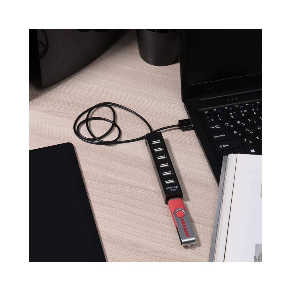 Разветвитель USB на 7 портов, черный REXANT 18-4107 позволяет подключить одновременно большое количество съемных устройств с USB выходами (жесткие диски, флеш-карты, джойстики, мыши, клавиатуры, модемы, роутеры, фотоаппараты, смартфоны, планшетные компьютеры и пр.). Благодаря малому размеру и весу хаб очень удобно брать с собой, например, вместе с ноутбуком. Устройство не требует внешнего источника питания. Обеспечивает высокую скорость передачи данных