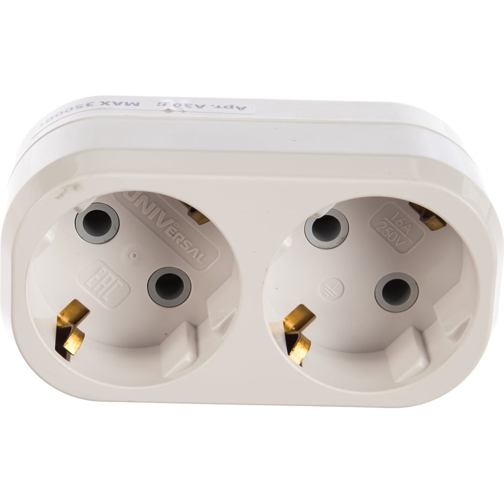 Плоский разветвитель 2 гнезда, заземление, белый 16А 250В UNIVersal А302 - простое и удобное устройство для разветвления одной стационарной розетки и возможности подключения одновременно двух бытовых электроприборов. Заземление обеспечивает повышенный уровень электробезопасности.