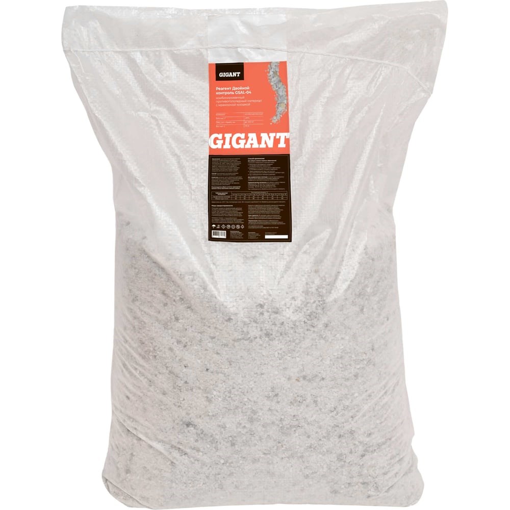 Реагент Двойной Контроль, до -25С, 20кг, мешок Gigant GSAL-04 применяется для уборки снежного наката и льда. Средний расход составляет 80 грамм на квадратный метр, что довольно экономично, поэтому средства хватит на долгое время. Благодаря экологичному составу минимально воздействует на обувь и одежду. Эффективность реагента проявляется при температуре до 25 градусов ниже нуля. Методика применения: Для ликвидации снежного наката и льда очистить поверхность от рыхлого снега и распределить реагент по всей поверхности. Подождать от двух до двенадцати часов в зависимости от температуры и толщины слоя льда и снега. Убрать разрушенный лед и снег - использовать щетку или лопату. Для профилактики периодически проводить обработку территории.