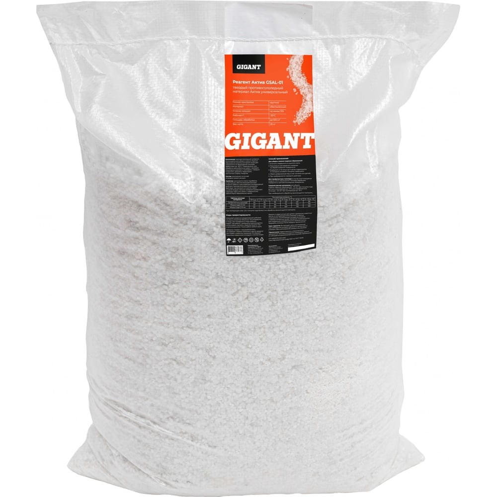 Реагент Актив Gigant -30C 20кг, мешок GSAL-01 применяется для уборки снежного наката и льда. Действие вещества начинается через 15 минут после нанесения, что обеспечивает быстрое удаление снега. Состав: композиция на основе хлоридов натрия, кальция Средний расход составляет 70 грамм на квадратный метр, что довольно экономично, поэтому средства хватит на долгое время. Работает при 30 градусах мороза, за счёт чего отличается практичностью. Способ применения: Для ликвидации снежного наката и льда очистить поверхность от рыхлого снега и распределить реагент по всей поверхности. Затем подождать от 15 минут до трех часов в зависимости от температуры и толщины слоя льда и снега. Убрать разрушенный природный материал - использовать щетку или лопату. В профилактических целях аккуратно обработать поверхность тонким слоем продукта.