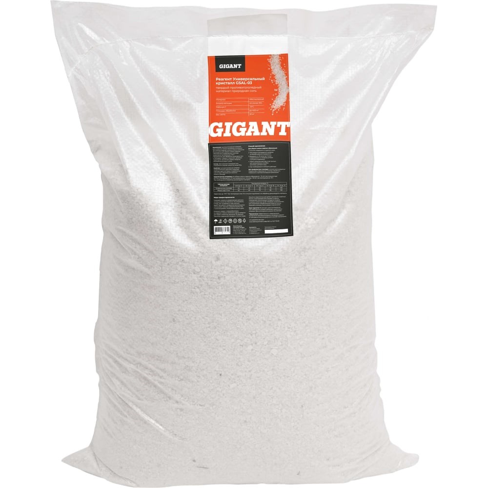 Реагент Gigant Универсальный Кристалл -15C 20кг, мешок GSAL-03 применяется для уборки снежного наката и льда. Средний расход составляет 70 грамм на квадратный метр, что довольно экономично, поэтому средства хватит на долгое время. Работает при 15 градусах мороза, за счёт чего отличается практичностью. Благодаря экологичному составу минимально воздействует на обувь и одежду. Методика применения: Убрать с поверхности рыхлый снег. Реагент распределить равномерно по всей обрабатываемой территории. Подождать от трех часов до суток и приступать к удалению разрушенного снежно-ледяного слоя - использовать лопату или жесткую щетку. В профилактических целях обрабатывать покрытую плотным снегом или льдом территорию.