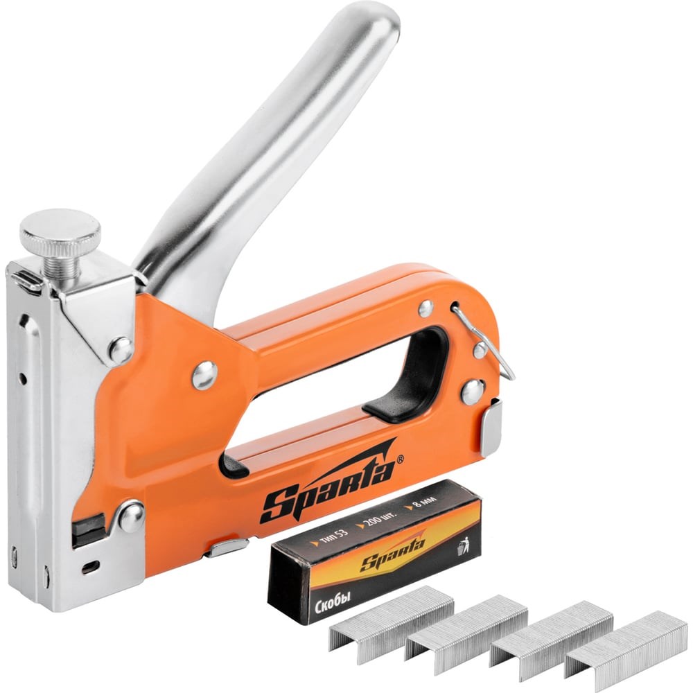 Регулируемый мебельный степлер Sparta 42002 с скобами 200 шт. совместим с крепежом типа 53 размером 4-14 мм, поставляется со скобами в количестве 200 шт. и используется для быстрого крепления на деревянном основании фанеры, оргалита, ДВП, ДСП, утеплителя, пленки и других листовых материалов. Будет полезен во время сборки шкафов, обивки мягкой мебели, а также выполнения теплоизоляционных и других крепежных работ.