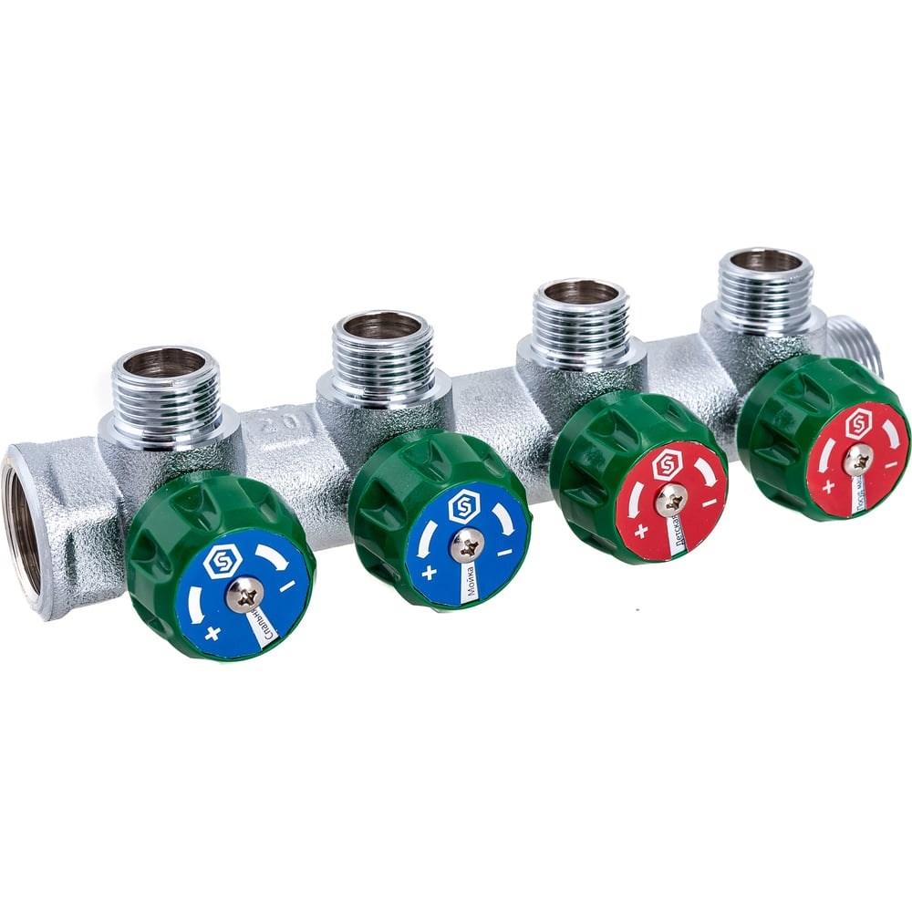 Регулирующий коллектор STOUT 3/4, 4 отвода 1/2, плоское уплотнение SMB-6849-341204 RG008UJF00344S предназначен для параллельного присоединения отдельных санитарно-технических приборов к магистральным трубопроводам систем холодного и горячего водопровода. На ответвлениях коллекторов установлены вентили для отключения потребителей и регулирования напора воды. Коллектор может иметь от 2-х до 4-х ответвлений с прямыми запорными механизмами вентильного типа. Герметичная камера запорного механизма заполнена смазочным материалом, обеспечивающим длительную эксплуатацию, легкое открытие или закрытие вентиля.