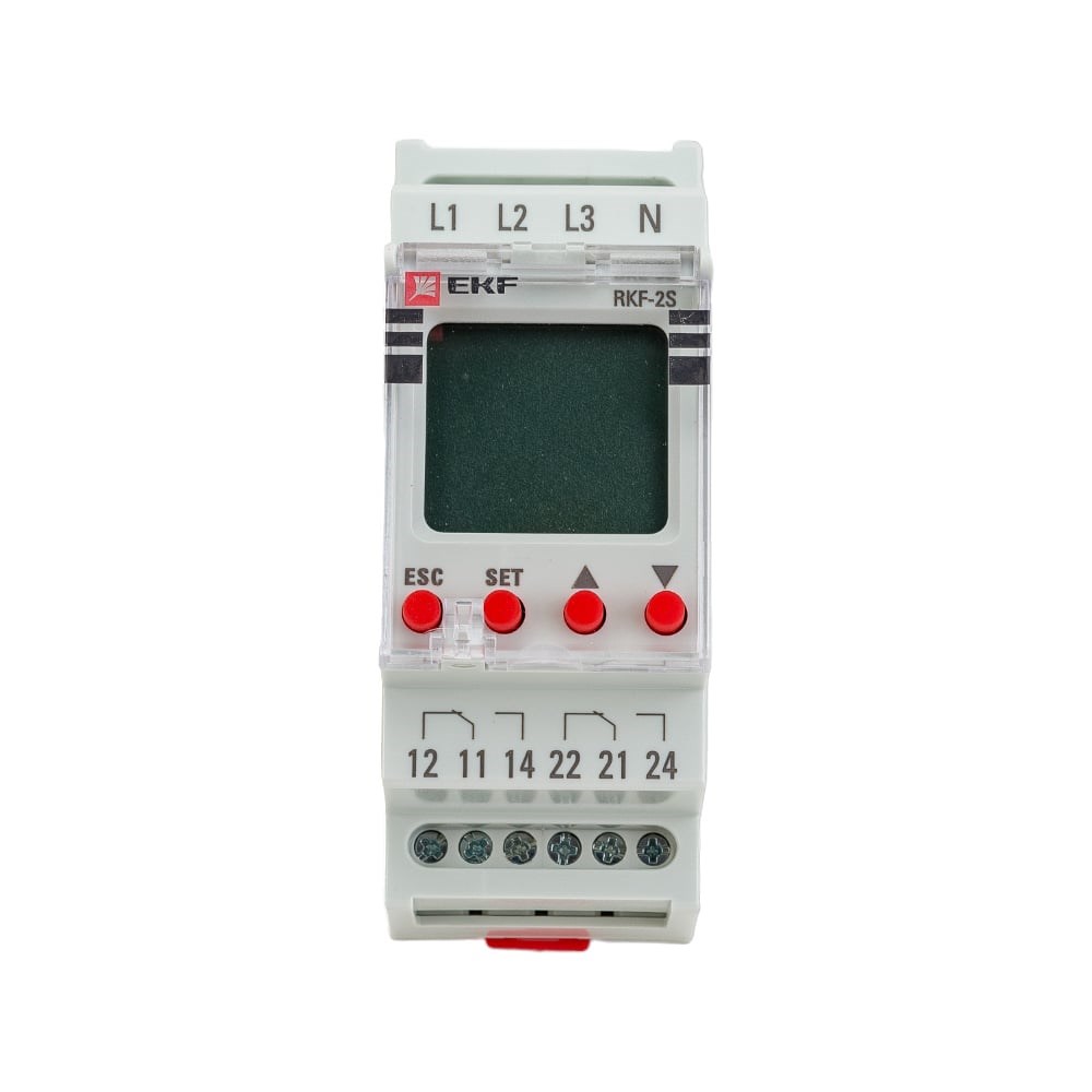Многофункциональное реле контроля фаз RKF-2S EKF PROxima c жидкокристаллическим дисплеем является устройством на базе микроконтроллера. Реле имеет информативный жидкокристаллический дисплей с подсветкой цвета «лунный свет», кнопки управления и задания параметров, расположенные на лицевой панели. Реле способно отображать напряжение относительно фазы и нуля (работа в режиме вольтметра), позволяет устанавливать время задержки включения при первом включении или после аварийного срабатывания, позволяет включать или выключать автоматический режим включения после возникновения аварийной ситуации, позволяет включать или выключать функции контроля напряжения и чередование фаз. На чередование фаз нельзя настроить задержку включения или выключения, реле реагирует мгновенно. На отсутствие фаз можно настроить только задержку на включение после аварии. На пропадание реагирует мгновенно. Устройство может работать в режимах: реле контроля фаз, реле напряжения, вольтметр.