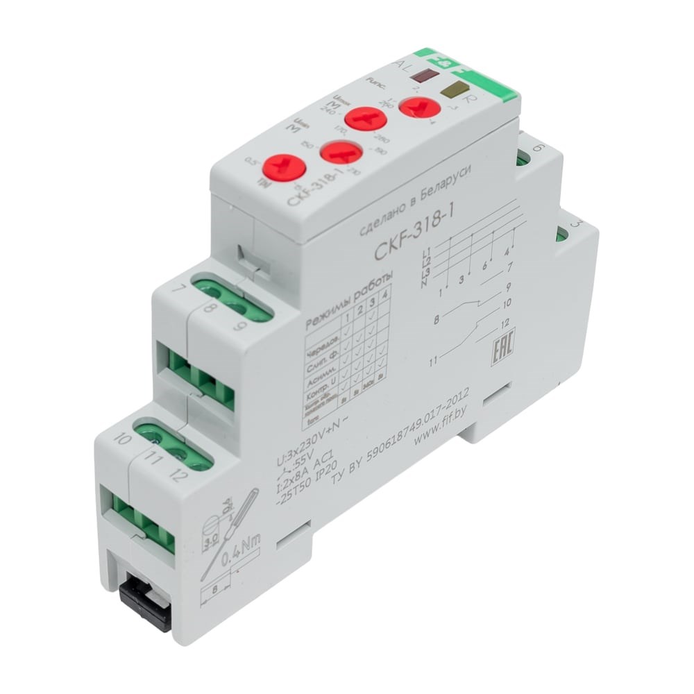 Реле контроля фаз CKF-318-1 предназначено для защиты электродвигателей и электроустановок, питаемых от трехфазной сети в случаях: отсутствия напряжения хотя бы в одной из фаз, асимметрии напряжения, повышения напряжения, снижения напряжения, «слипания» фаз, нарушения чередования фаз, обрыва нулевого провода. Переключателем на лицевой панели устанавливается один из 4-х режимов работы. После подачи напряжения питания, если параметры сети в допустимых пределах, контакты 7-8, 11-12 замыкаются, горит жёлтый светодиод на лицевой панели. Нагрузка может быть подключена к сети питания. При выходе параметров сети за допустимые пределы контакты 7-8, 11-12 размыкаются, и нагрузка отключается. Включение происходит автоматически после восстановления сетевого напряжения питания.