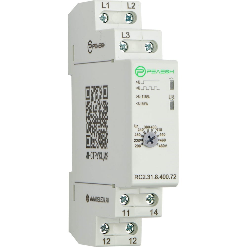 Реле контроля фаз РЕЛЕОН обрыв фаз, повыш U, пониж U; 1CO конт. 8А; 400В AC; RC231840072 предназначено для защиты промышленного трехфазного оборудования от повышенного или пониженного напряжения и пропадания фаз. В случае перенапряжения, пониженного напряжения или пропадания фаз, реле мгновенно переключит выходную цепь. Реле автоматически переключит выходные контакты при восстановления напряжения сети до нормального состояния. Перенапряжение и значения пониженного напряжения фиксированы. Диапазон напряжения питания: 165-528В. Диапазон измерения: 150-552В. Верхний предел отключения: 115% Un. Нижний предел отключения: 85% Un. Задержка отключения по верхнему пределу: Фиксированная: 2с. Задержка отключения по нижнему пределу: Фиксированная: 2с. Задержка отключения по асимметрии: Фиксированная: 2с. Гистерезис напряжения: 6В. Время срабатывания из-за обрыва фазы: <0,5с. Погрешность измерения напряжения: ≤1%. Погрешность задержки: ±10%+0,1с. Номинальное напряжение изоляции: 480В. Номинальный ток АС1: 8А/250В. Механическая долговечность: 106 циклов. Электрическая долговечность: 105 циклов. Степень защиты: IP20. Сечение провода: 0,5-2,5мм2. Момент затяжки: 0,5Нм.