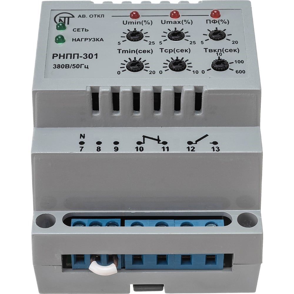 Реле Новатек-Электро РНПП-301 предназначено для защиты трехфазной сети от выхода действующего значения напряжения за пределы допустимых порогов,нарушения последовательности и слипания фаз, нарушения полнофазности и симметричности сетевого напряжения. Контролирует основные параметры электрической сети и при их отклонении отключает нагрузку. Светодиоды на лицевой панели реле индицируют наличие напряжения в сети, вид возникшей аварии, состояние нагрузки. С помощью потенциометров на лицевой панели можно установить порог срабатывания по максимально допустимому значению напряжения, порог срабатывания по минимально допустимому значению напряжения, порог допустимого значения перекоса фаз, время срабатывания реле при аварийном снижении напряжения, время срабатывания реле при прочих видах аварии сети, задержку времени включения нагрузки после восстановления параметров сети.