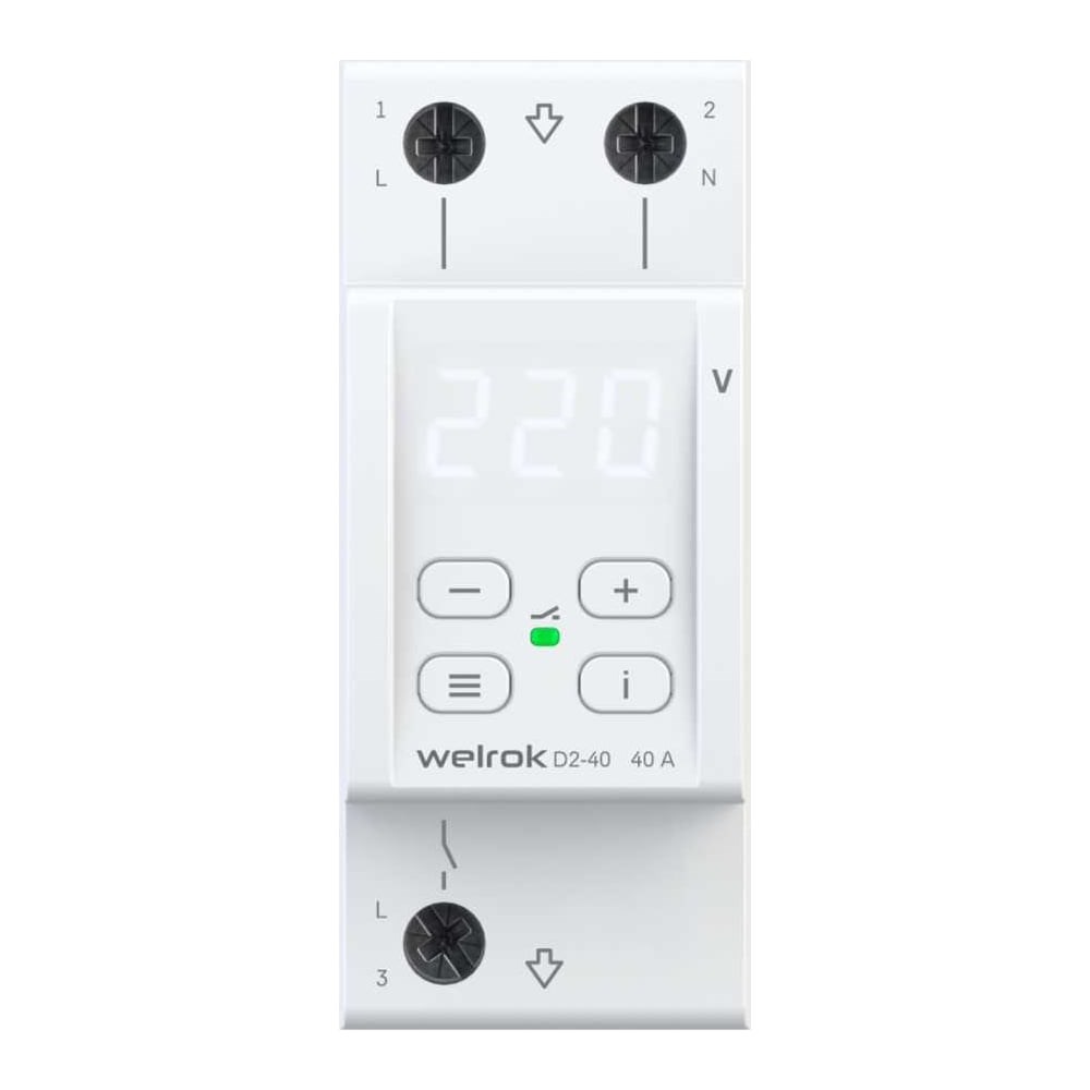 Реле напряжения Welrok d2-40 4660251140021 защищает оборудование от скачков и провалов напряжения, обрыва нулевого провода. Реле отключает нагрузку, если сетевое напряжение выходит за установленные пределы. Когда значение напряжения вернется в норму, нагрузка будет автоматически включена обратно. Подключение можно сделать с транзитом или без транзита нуля через Welrok D2. При этом вход нуля может быть как вверху так и внизу реле. Welrok D2 - компактное реле на 2 модуля с мощным функционалом: Скорость срабатывания реле < 0,03 сек.. TrueRMS для точного измерения напряжения. Для уменьшения количества срабатываний: Защита от частых срабатываний. Регулируемый гистерезис. Регулируемая задержка включения нагрузки. Профессиональная модель отключения при выходе напряжения за пределы. Для анализа питающей сети по характеру аварийных срабатываний: Журнал срабатываний на 100 значений. Для комфортной и безопасной эксплуатации: Поправка напряжения на экране. Регулировка яркости экрана. Защита от перегрева. Корпус реле напряжения изготовлен из пластика, не поддерживающего горение.