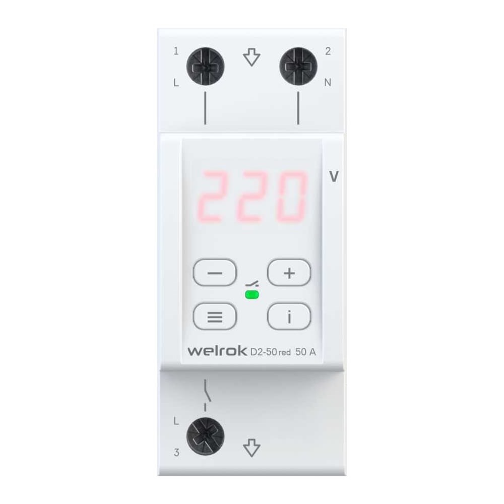 Реле напряжения Welrok d2-50 red 4660251140090 защищает оборудование от скачков и провалов напряжения, обрыва нулевого провода. Реле отключает нагрузку, если сетевое напряжение выходит за установленные пределы. Когда значение напряжения вернется в норму, нагрузка будет автоматически включена обратно. Подключение можно сделать с транзитом или без транзита нуля через Welrok D2. При этом вход нуля может быть как вверху так и внизу реле. Welrok D2 - компактное реле на 2 модуля с мощным функционалом: Скорость срабатывания реле < 0,03 сек. TrueRMS для точного измерения напряжения. Для уменьшения количества срабатываний: Защита от частых срабатываний. Регулируемый гистерезис. Регулируемая задержка включения нагрузки. Профессиональная модель отключения при выходе напряжения за пределы. Для анализа питающей сети по характеру аварийных срабатываний: Журнал срабатываний на 100 значений. Для комфортной и безопасной эксплуатации: Поправка напряжения на экране. Регулировка яркости экрана. Защита от перегрева. Корпус реле напряжения изготовлен из пластика, не поддерживающего горение.