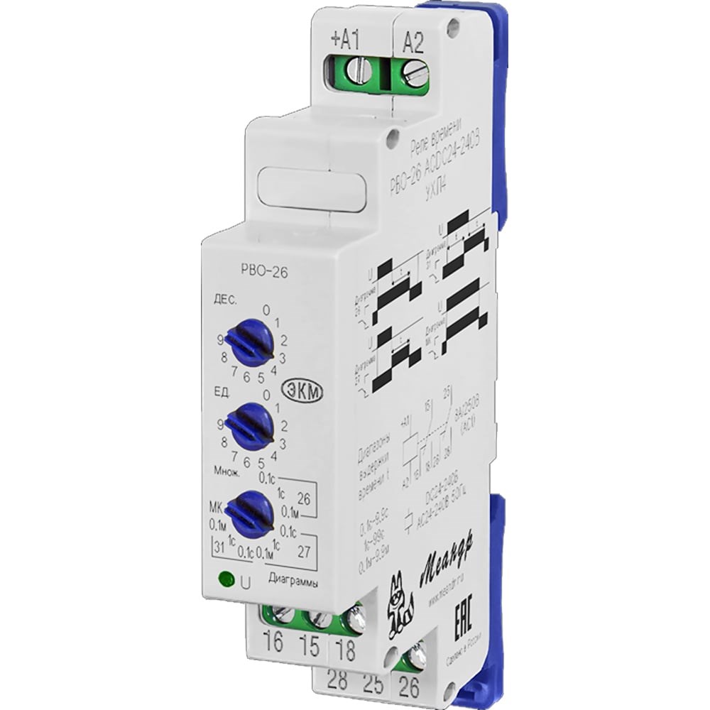 Реле времени РВО-26 ACDC24-240В УХЛ4 (артикул A8302-16930685) предназначено для формирования задержки на выключение исполнительного реле после снятия напряжения питания или для включения исполнительного реле после снятия напряжения питания на предварительно установленную выдержку времени.Основные особенности:Выдержка времени после отключения напряжения питания: 0,1— 9,9с, 1— 99с и 0,1— 9,9минУстановка выдержки времени двумя десятичными переключателями с шагом 1% от максимального значения диапазонаТри диаграммы работы или функция мгновенного контакта (указаны в техническом описании)Индикатор наличия питанияВыходные контакты: 2 переключающих [8А]; 1 переключающий [5А]Корпус: 1 модуль (18мм)Способ монтажа: на DIN рейку, на плоскость.