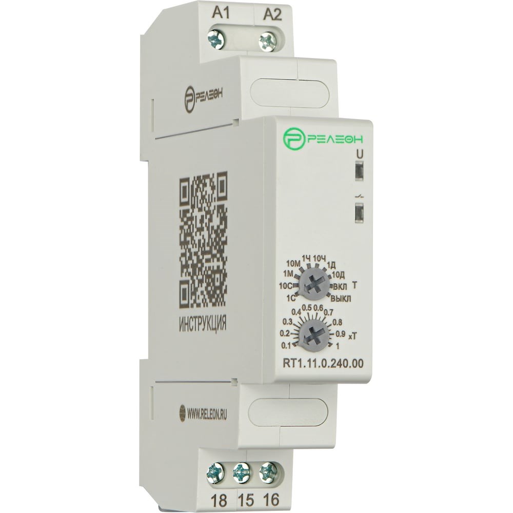Реле времени РЕЛЕОН задержка включения, 1 перекидной контакт 8А; 24-240 AC/DC; RT111024000 предназначено для управления нагрузкой с заданной пользователем задержкой на включение. Функция задержка включения. Питание подается на таймер. Контакт замыкается по прошествии предустановленного времени. Сброс происходит при выключении питания. Положение регулятора времени: 1сек., 10сек., 1мин., 10мин., 1час, 10час., 1день, 10дней, Вкл., Выкл.