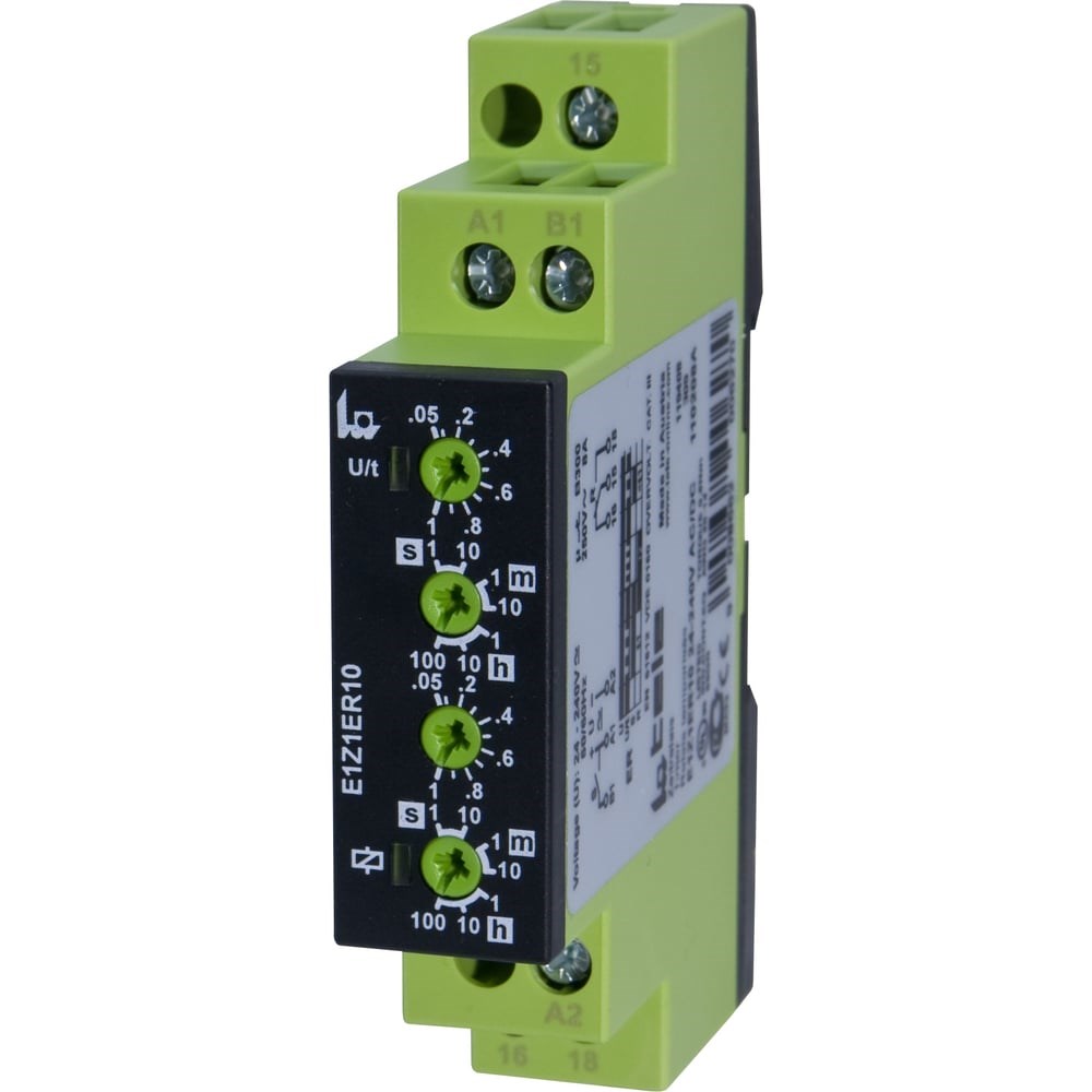 Реле времени TELE задержка включения и выключения E1Z1ER10 24-240V AC/DC VE10 110208Aвыделяется тем, что заменяет собой сразу два реле времени с разными функциями времени. Обычно, если требуется организовать задержку включения и задержку выключения используют два реле времени с соответствующей функцией времени. Данное реле времени позволяет организовать обе задержки времени - задержку включения и задержку выключения, с помощью одного реле времени. Длительность задержки включения и длительность задержки выключения настраиваются независимо друг от друга, могут быть установлены от 50мс до 100 часов каждая. Реле времени E1Z1ER10 24-240V AC/DC VE10 110208A работает следующим образом: Напряжение питания должно быть подано на клеммы A1 и A2 постоянно. Задержка включения начинает отсчитываться при замыкании контакта управления S (на клемму B1 необходимо подать такой же потенциал как и на клемме A1). После того, как завершится отсчет времени задержки включения, выходной контакт реле времени переключится, будут замкнуты клеммы 15-18. При размыкании контакта управления S, начнется отсчет времени задержки выключения. По завершении отсчета времени задержки выключения, выходной контакт реле времени переключится, будут замкнуты клеммы 15-16, разомкнуты клеммы 15-18.