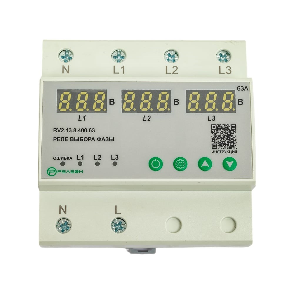 Реле выбора фазы RV2.13.8.400.63 предназначено для обеспечения бесперебойного питания особо ответственных промышленных и бытовых однофазных потребителей 230В 50Гц от трехфазной четырехпроводной сети и защиты их от недопустимых колебаний напряжения в сети. Реле отображает действующее значение фазного напряжения в сети, наличия ошибки и выбранной фазы на лицевой панели. В случае перенапряжения, пониженного или отсутствия напряжения на приоритетной фазе, реле мгновенно (или с задержкой) переключит потребителя на другую исправную резервную фазу. При отсутствии заданной пользователем приоритета фаз, прибор автоматически производит выбор наиболее оптимальной фазы. Автоматическое восстановление подключения потребителя к приоритетной фазе с задержкой по времени при нормализации напряжения на ней. Перенапряжение и значения пониженного напряжения, время задержки и приоритетная фаза могут быть настроены самостоятельно.