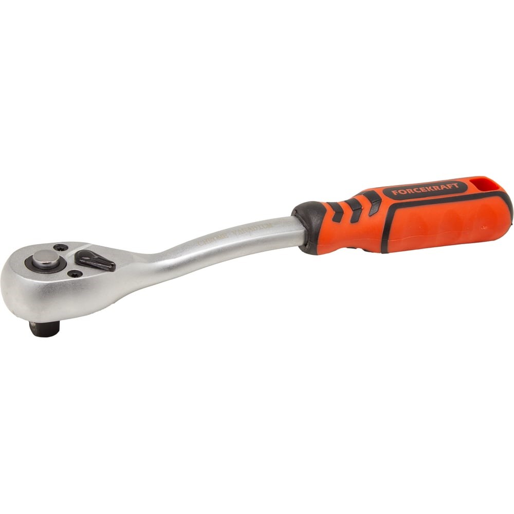 Трещотка реверсивная 1/4" с резиновой ручкой от бренда FORCEKRAFT представляет собой ручной инструмент для слесарных работ с крепежом, монтаж и демонтаж резьбовых соединений совместно с головками. По другому ещё называют трещотка для головок. Трещотка с присоединительным квадратом 1/4" длиной 150 мм и 2-компонентной рукояткой предназначен для монтажных работ с резьбовыми соединениями. Храповый механизм с 72 зубцами обеспечивает высокую плавность работы. Ключи трещотки напоминают в работе обычные накидные гаечные ключи, но при этом трещоточный ключ значительно экономит время и силы. Благодаря реверсивному механизму ключ-трещотку можно использовать как для откручивания, так и для закручивания крепежей. Трещотка ключ обладает кнопкой быстрого сброса, что упрощает съем и установку насадок. Ключ с квадратом 1/4" надежно фиксирует оснастку и не дает соскальзывать во время работы. Трещотка для головок изготовлена из прочной стали хромованадиевой группы. Трещеточный ключ имеет удобную двухкомпонентную ручку, которая надежно фиксирующаяся в руке, что позволяет работать в труднодоступных местах и обеспечивает надежное удержание инструмента в руке. Ключ-трещотка широко применяется в автосервисе, промышленности и строительстве. Ручной инструмент предназначен для работы в местах со стесненным пространством. Трещотки для головок помогают справиться с любым крепежом в условиях, когда ключ невозможно перекидывать.