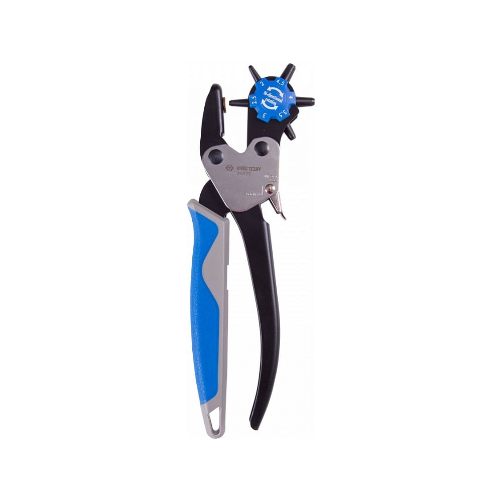 Револьверный дырокол KING TONY 2-4.5 мм, 230 мм 74A00 используется для пробивки отверстий в коже, картоне, ткани и других мягких материалах. Может применяться на станциях технического обслуживания (СТО), в автосервисах, автомастерских, производствах и в бытовой сфере. 6-позиционная головка револьверного типа позволяет легко настроить необходимый размер пробивного отверстия. Система сбора отходов облегчает использование инструмента. Клавиша блокировки обеспечивает безопасную работу. Размеры пробивных отверстий – Ø 2, 2.5, 3, 3.5, 4, 4.5 мм.