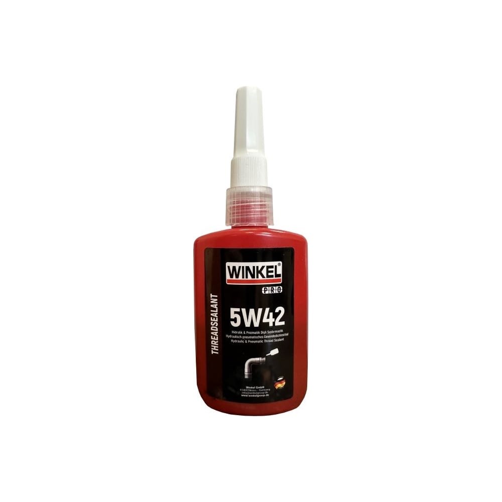 WINKEL PRO 5W42 - анаэробный резьбовой герметик средней прочности для резьбовых соединений в гидравлических и пневматических системах. Обеспечивает герметизацию жидкостей, сжатого воздуха, газа, топлива и др.химических продуктов, используемых в частных и промышленных объектах. Обладает высокой устойчивостью к температурам.Применение:Детали, подлежащие нанесению, должны быть сухими, чистыми и обезжиренными. Рекомендуется очистить поверхность с помощью очистителя WINKEL PRO Fast Cleaner (арт. для заказа 20071).Нанесите средство на резьбу полным оборотом и соедините детали. После затяжки не перемещайте их в период сушки. Полное высыхание занимает максимум 24 часа в зависимости от типа металла.