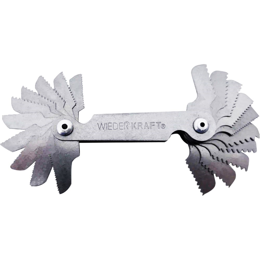 Резьбовой шаблон WIEDERKRAFT резьбомер, шагомер, 60 град и 55 град WDK-MG5560 предназначен для определения номинального шага (ниток на дюйм) дюймовой резьбы (55°) и метрической резьбы (60°).Инструменты выполнены из качественной стали, благодаря чему отличаются надежностью и долговечностью.