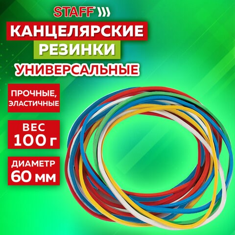Резинки банковские универсальные диаметром 60 мм, STAFF 100 г, цветные, натуральный каучук, 440118