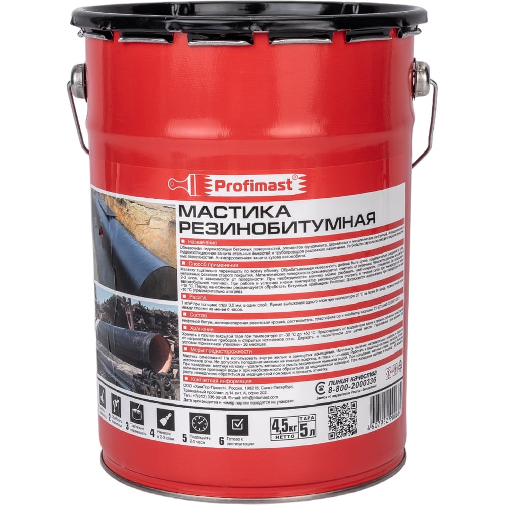 Резинобитумная мастика Profimast 5 л / 4,5 кг 4607952900684 позволяет увеличить срок службы строительных конструкций. Продукт создает антикоррозионную и гидроизоляционную защиту стальных ёмкостей и трубопроводов различного назначения. Незаменима для устройствоа звукопоглощающего покрытия тонкостенных поверхностей.