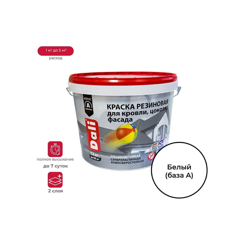 Предназначена для защитно-декоративное окрашивание крыш, фасадов, цоколя зданий и сооружений, требующих долговременной эксплуатации и подверженных образованию трещин, для декоративного окрашивания стен и потолков в жилых и общественных помещениях с повышенной влажностью воздуха или неотапливаемых Применяется снаружи и внутри помещений. Состав: суспензия пигментов, загустителей, адгезионных и других функциональных добавок в смеси полиакриловых дисперсий; Методы нанесения: кисть, валик, распыление; Разбавитель: вода; Температура применения: от +10°С; Количество слоев: 2; Расход: 1 кг до 5 м²; Высыхание: межслойная сушка на вертикальных поверхностях - 1 час/межслойная сушка на горизонтальных поверхностях - до 2 часов/окончательный набор прочности покрытия - до 7 суток; Степень глянца: глубокоматовый; Смываемость плёнки краски: 2 г/м²; Относительное удлинение при разрыве: 150%; Очистка инструмента: вода; Колеровка: да, по каталогам: NCS 1950, Nova 2024, RAL; Цвет: белый; Вес: 12 кг. Белый (база A)