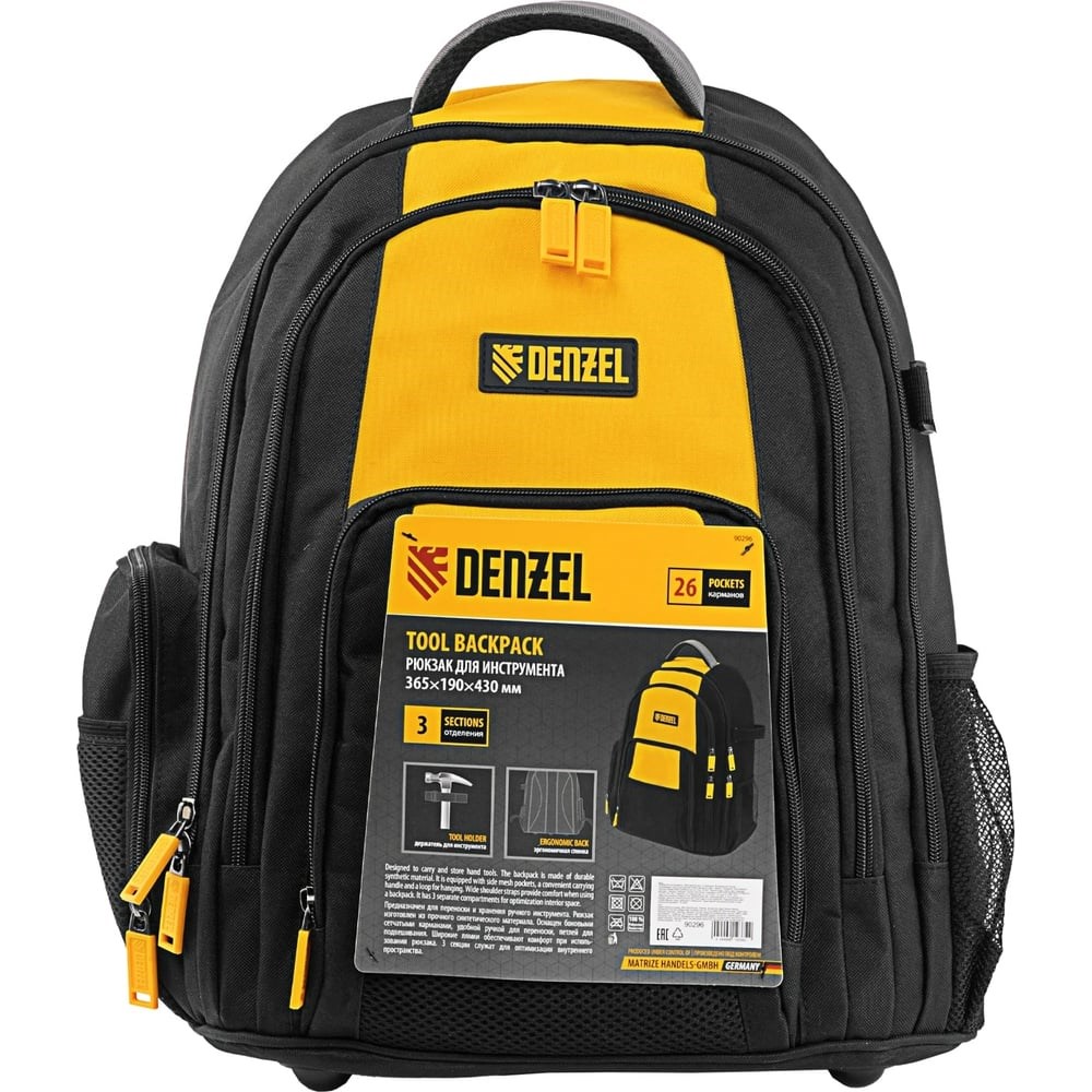 Рюкзак Denzel 90296 размером 365 х 190 х 430 мм, с 3 отделениями и 26 карманами (в том числе сетчатыми), предназначен для размещения и транспортировки ручного инструмента. 3 секции позволяют организовать упорядоченное хранение всех необходимых предметов. Рюкзак пригодится выездному мастеру.